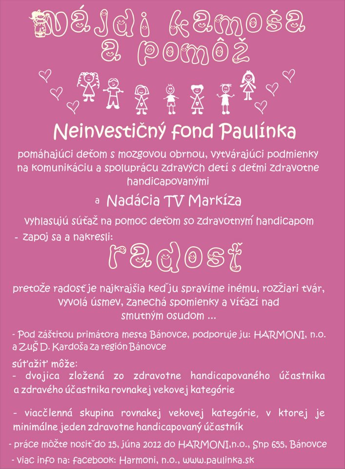 Neinvestičný fond Paulínka pomáha deťom s detskou mozgovou obrnou, vytvára podmienky na komunikáciu a spoluprácu zdravých detí s deťmi zdravotne handicapovanými.